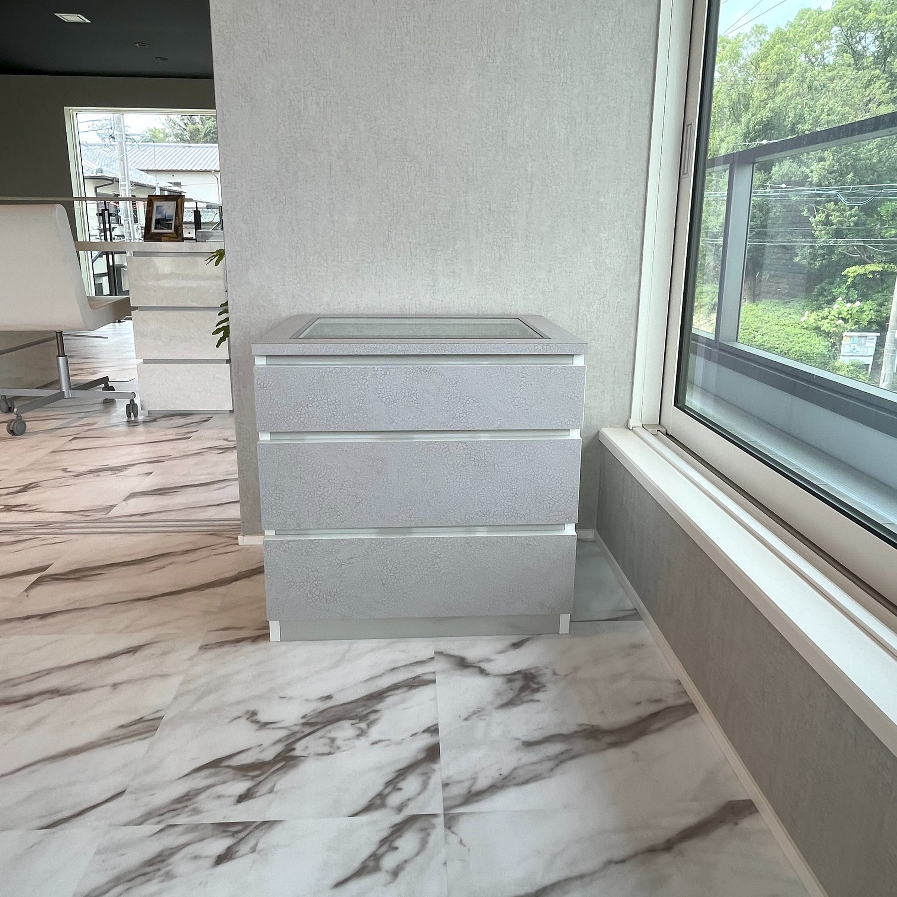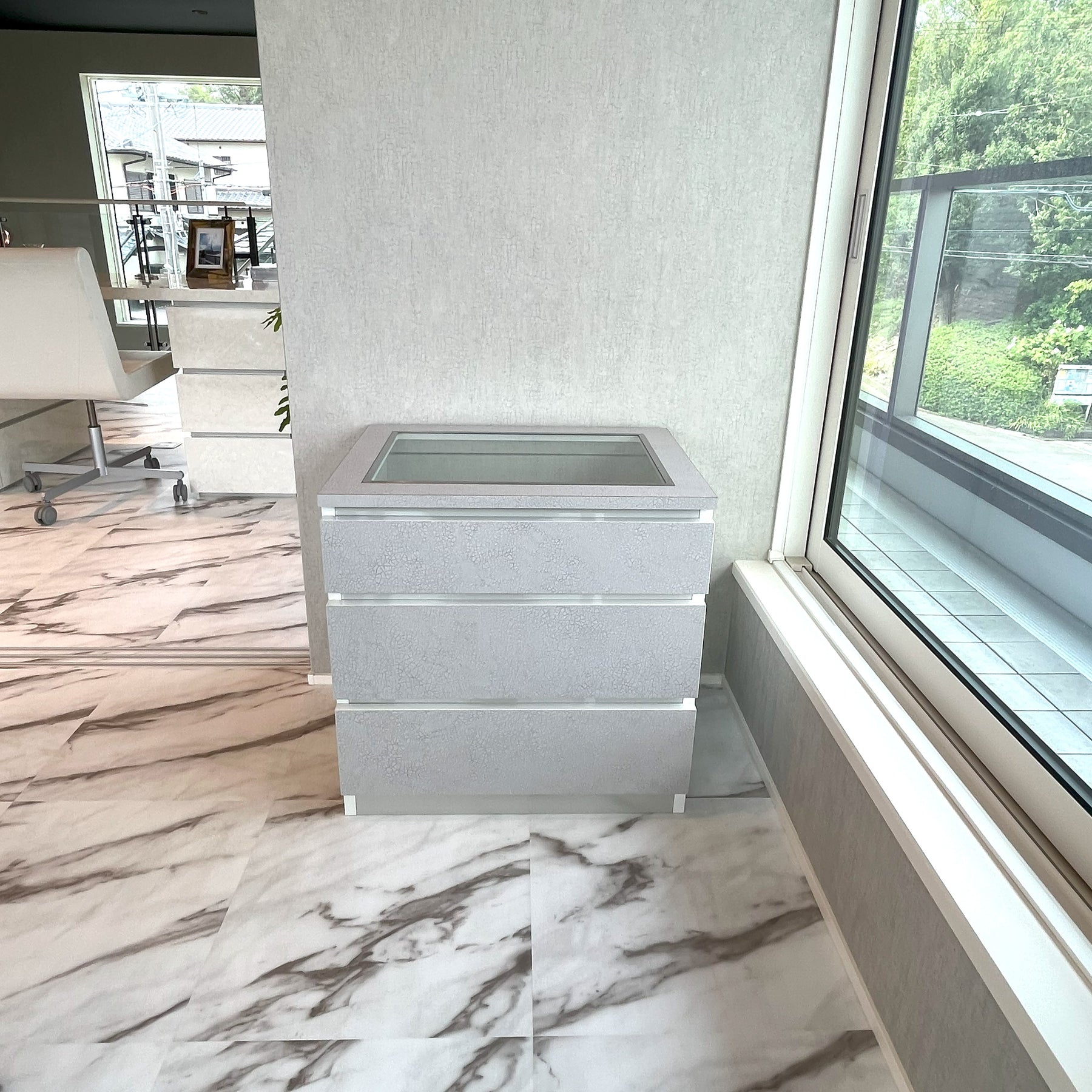 大切なものほどそばに置きたい。そんなお客さまの声に応えたサイドテーブルです。 ベッド脇に置くナイトテーブルとして、リビングやソファの間に置くサイドテーブルとして、または美容室やカフェなどの店舗内のディスプレイテーブルとしてもお使いいただけます。 上板はガラス窓ですので、埃を気にすることなく、ディスプレイできます。 1段目はディスプレイ、2段目・3段目は収納庫としてお使いください。 コレクション用のディスプレイや普段使いの身に着けるアクセサリーや時計など無くしやすい小物などの保管用として最適なインテリア家具です。 実用新案取得:第3207768号