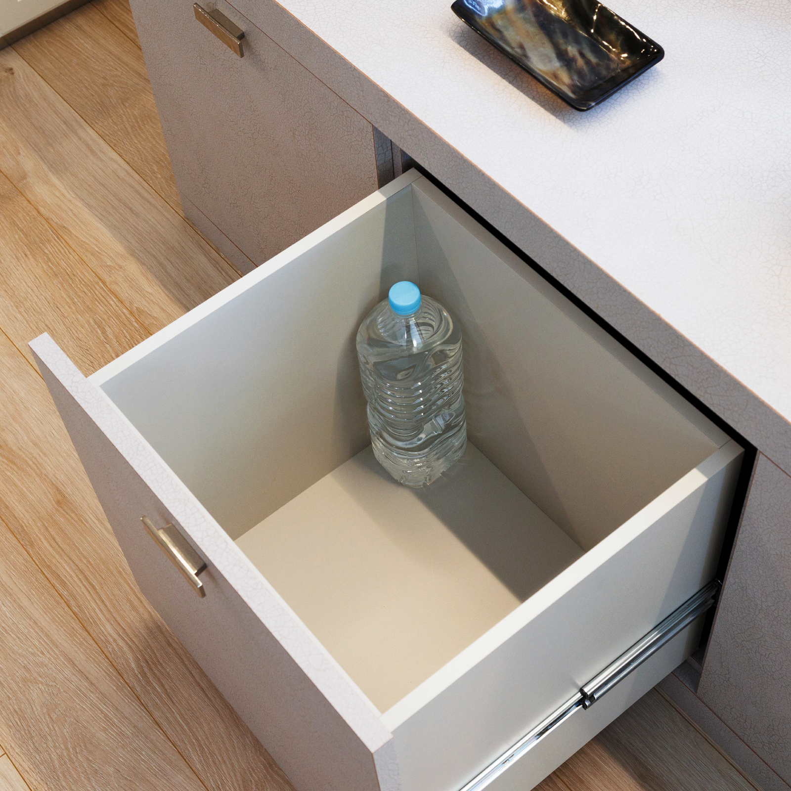 力が弱い方でも軽く開く、ポンっと軽く押すだけでやさしく静かに閉まるなどの機能を持ったブルーモーションレールを使用しています。引き出しの開閉が静かで、耐久性も高いのが特徴です。